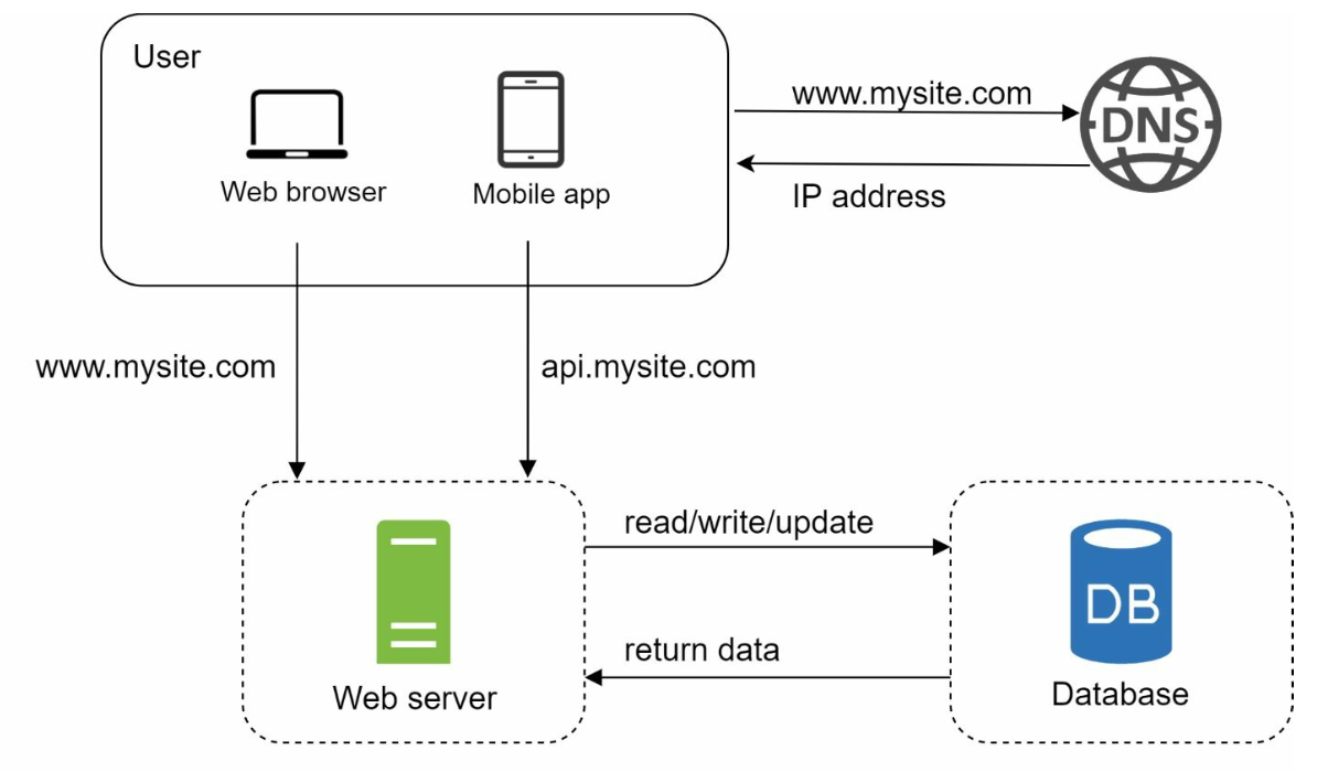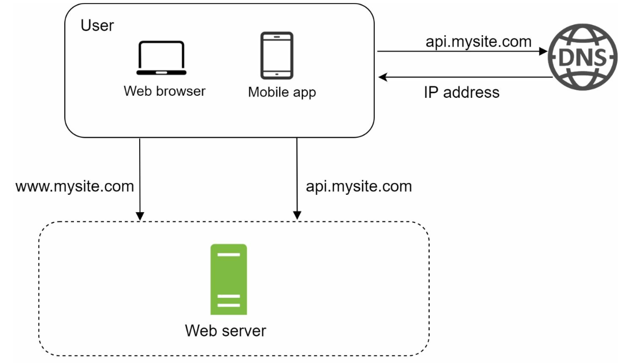 api.mysite.com), resolved to IP addresses using DNS. - IP address of the web-server is returned to the browser or mobile app.